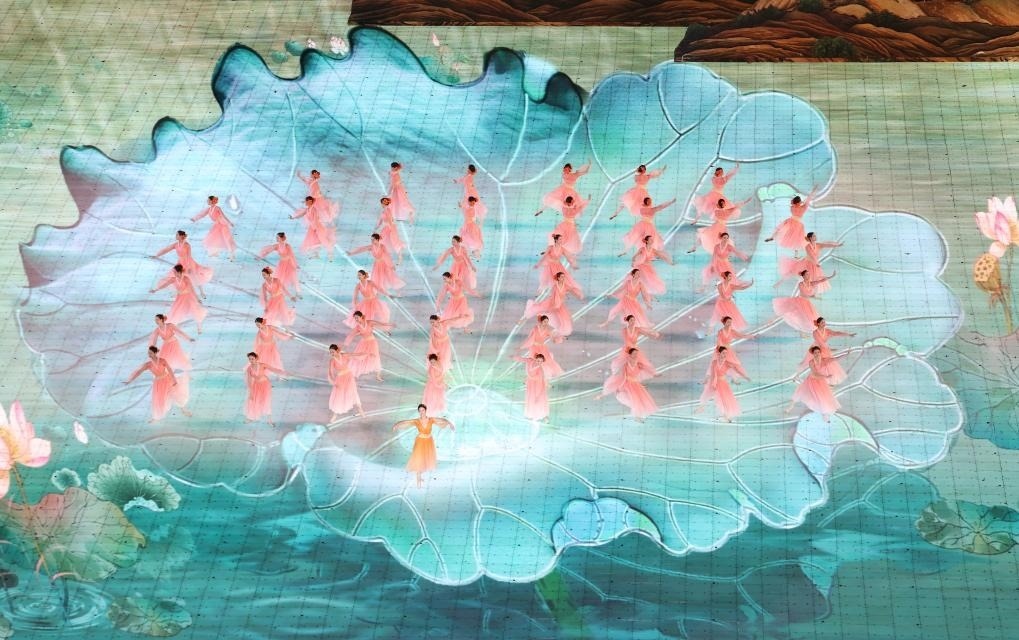 地屏上,錯(cuò)落有致的立體山水映襯著江南朦朧的裸眼3D視效,營(yíng)造出輕煙繚繞、水光瀲滟的江南畫(huà)境。國(guó)風(fēng)男子揮毫作畫(huà),風(fēng)雅錢(qián)塘展現(xiàn)在觀眾眼前。煙雨西湖上,碩大的蓮葉舒展,清雅雋秀的女子翩然起舞,仿若盛開(kāi)的蓮花。