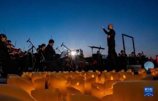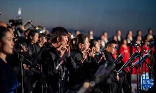 來自昆明聶耳交響樂團(tuán)及昆明市民族歌舞劇院民樂團(tuán)的演奏家們在昆明市滇池畔共同演奏包括《義勇軍進(jìn)行曲》《賣報(bào)歌》在內(nèi)的聶耳代表作(7月17日攝)。