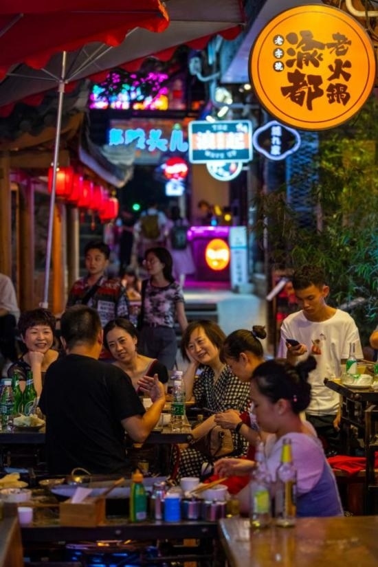 2021年7月1日,在四川省成都市成華區(qū)的猛追灣旅游休閑街區(qū),人們?cè)诿朗骋粭l街“香香巷”中吃火鍋。新華社記者 沈伯韓 攝