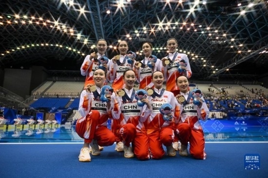 7月21日,中國(guó)隊(duì)在頒獎(jiǎng)儀式上。當(dāng)日,在日本福岡舉行2023年世界游泳錦標(biāo)賽花樣游泳集體自由自選決賽中,中國(guó)隊(duì)以329.1687分的成績(jī)獲得冠軍。新華社記者 夏一方 攝