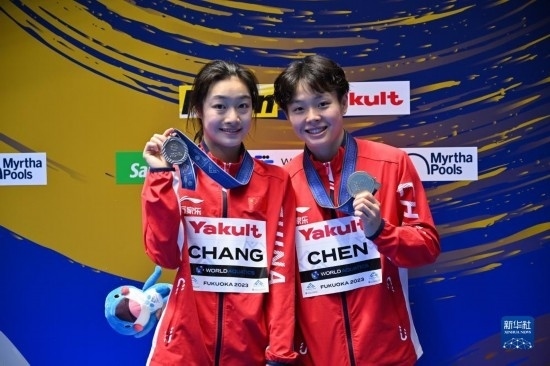 7月21日,冠軍中國(guó)選手陳藝文(右)和亞軍中國(guó)選手昌雅妮在頒獎(jiǎng)儀式上。當(dāng)日,在日本福岡舉行的2023年世界游泳錦標(biāo)賽跳水女子單人三米板決賽中,中國(guó)選手陳藝文、昌雅妮分別以359.50分和341.50分的成績(jī)包攬冠亞軍。新華社記者 張笑宇 攝
