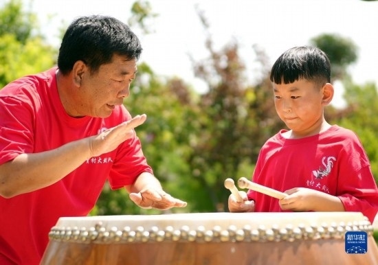 8月14日,在河北省滄州市滄縣舊州鎮(zhèn)賈村,大鼓藝人指導(dǎo)學(xué)生練習(xí)賈村大鼓。