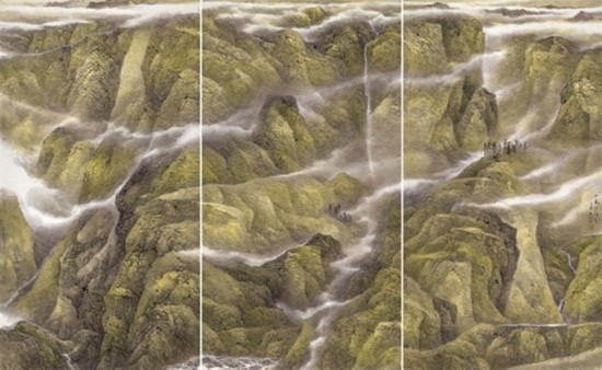 “山河”從來都不單純是自然山水的別稱,更多指代的是“社稷”與“國土”。在革命戰(zhàn)爭年代,“一寸山河一寸血,一抔熱土一抔魂”的詩句,不知激勵了多少仁人志士投身革命,為國捐軀。這個展覽以“山河回聲”為主題,也表明了樂震文、張弛的山水畫并不是傳統(tǒng)意義上臥游逍遙的文人山水,而是以山水建構現(xiàn)代人文精神內涵的國家史詩敘事。