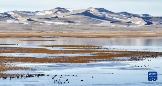 10月18日,在阿爾金山國(guó)家級(jí)自然保護(hù)區(qū),針尾鴨等水鳥(niǎo)在依協(xié)克帕提湖棲息(無(wú)人機(jī)照片)。