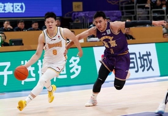 2022年3月1日,效力于新疆隊的曾令旭(右)在當年的CBA比賽中帶球突破。新華社記者 盧漢欣 攝