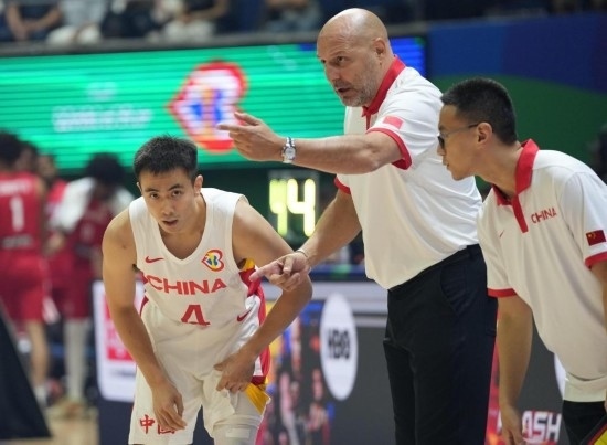 8月30日,中國隊主教練喬爾杰維奇(中)2023年籃球世界杯B組小組賽中指導球員趙繼偉(左)。新華社記者 孟永民 攝