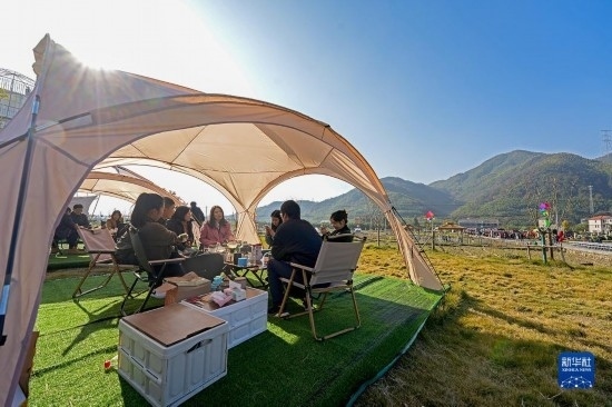 11月25日,在杭州市臨安區(qū)郎家村,游客在稻田文化節(jié)上體驗田園風光。