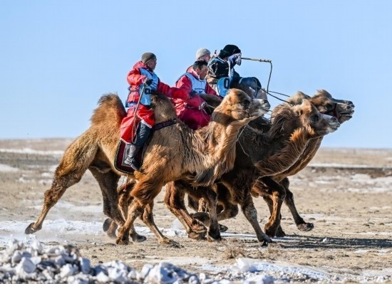 茫茫草原能賽馬,茫茫沙漠就能賽駱駝。2023年底在阿拉善右旗舉行的阿拉善萬峰駝那達慕大會上,設置了駱駝短距離速度賽、長距離耐力賽、接力賽等,還有駝球表演賽。按照當地牧民的說法,賽駱駝就得在冬天,因為冬天的駱駝最漂亮。