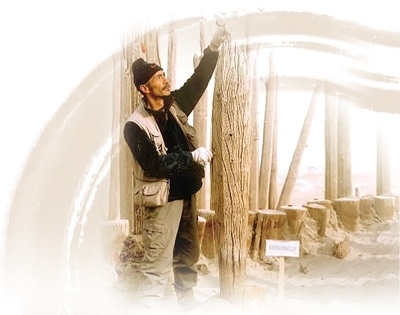 伊弟利斯在考古現(xiàn)場(chǎng)對(duì)一個(gè)胡楊立柱進(jìn)行測(cè)量。