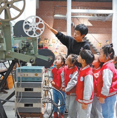 湖州市南潯鎮(zhèn)橫街電影博物館內,老師帶領孩子們了解電影放映機。張 斌攝