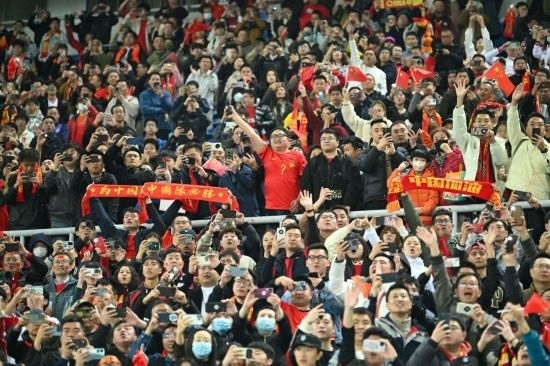 據(jù)主辦方介紹,天津奧體中心體育場的球票基本銷售一空,有42977名觀眾到場為中國隊(duì)助威。比賽在晚上8點(diǎn)開球,結(jié)束已是10點(diǎn)左右。初春夜晚加之冷風(fēng),寒意十足,但球迷的熱情和助威貫穿全程。