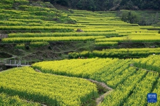 眼下,安徽省黃山市徽州區(qū)呈坎鎮(zhèn)靈山村的梯田油菜迎來(lái)盛花期,層層疊疊的梯田上綻放的油菜花猶如金色波浪,吸引各地游客前來(lái)賞花踏青。