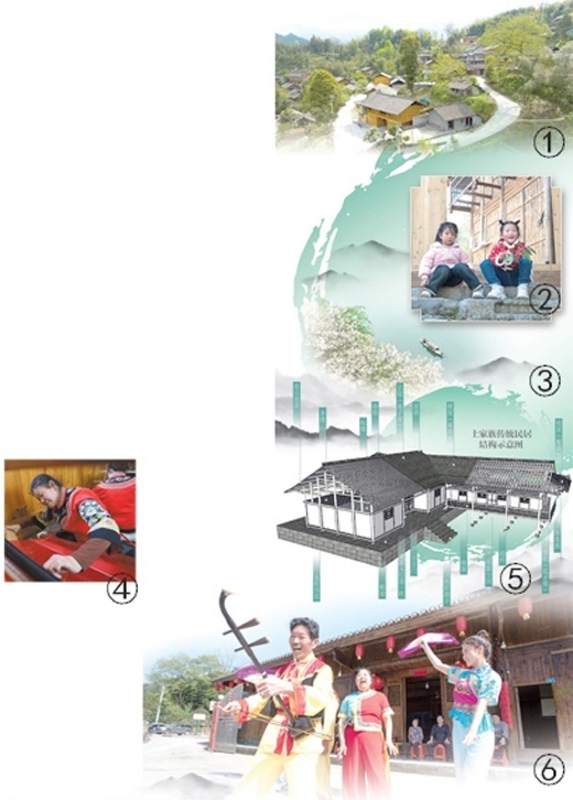 圖①:俯瞰龍鳳壩鎮(zhèn)大寨村。圖②:孩童們坐在龍鳳壩鎮(zhèn)大寨村的古民居前。圖③:大溪鄉(xiāng)前進村的臨水風(fēng)光。圖④:在龍鳳壩鎮(zhèn)大寨村,村民正制作土家織錦。圖⑤:土家族傳統(tǒng)民居結(jié)構(gòu)示意圖。張丹峰繪 圖⑥:在溪口鎮(zhèn)黃楊扁擔(dān)村,村民們演唱秀山民歌《黃楊扁擔(dān)》。圖①②③④⑥均為沈靖然、胡程攝影報道