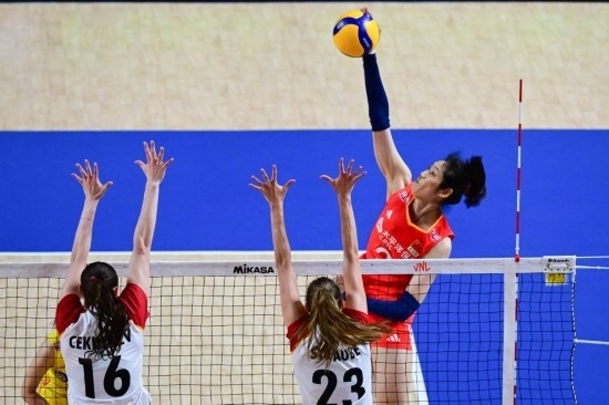 6月14日,中國(guó)隊(duì)球員朱婷(右上)在比賽中扣球。當(dāng)日,在世界女排聯(lián)賽中國(guó)香港站比賽中,中國(guó)隊(duì)3:0戰(zhàn)勝德國(guó)隊(duì)。新華社記者 朱煒 攝