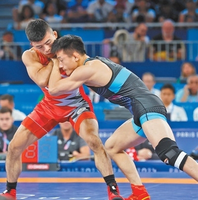作為2023年摔跤世錦賽該級別銅牌得主,“站上領(lǐng)獎(jiǎng)臺”是曹利國在巴黎奧運(yùn)會的目標(biāo)。雖然他在首場比賽中有些緊張,但還是以6∶2戰(zhàn)勝埃及隊(duì)選手穆阿蒙·穆罕默德。在1/4決賽中,他表現(xiàn)得更加自如,以5∶3戰(zhàn)勝委內(nèi)瑞拉隊(duì)選手羅德里格斯·奧羅斯科。半決賽曹利國對陣朝鮮隊(duì)選手李世雄,他在1∶3落后的情況下,最后時(shí)刻憑借邊界一記提抱摔將比分追至3∶3,憑借后得分取勝。