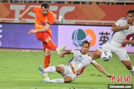 山東泰山隊(duì)卡扎伊什維利(左一)在比賽中射門。中新社發(fā) 陳陽 攝