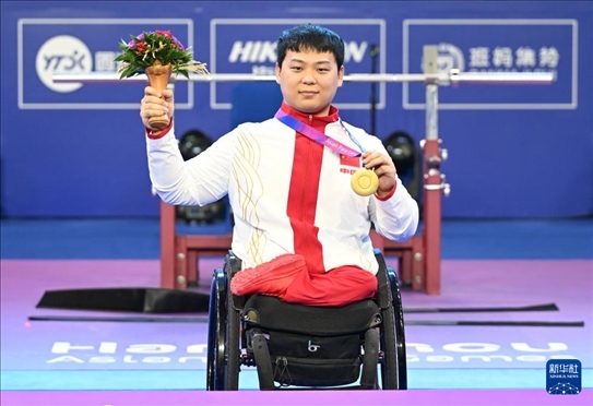 圖為2023年10月24日,中國選手齊勇凱在杭州第4屆亞殘運會舉重項目男子59公斤級頒獎儀式上。新華社記者 貝赫 攝