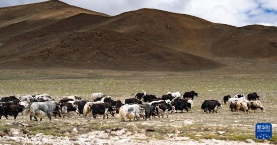 8月24日,一群牦牛行走在雅魯藏布江源頭附近的草地上。