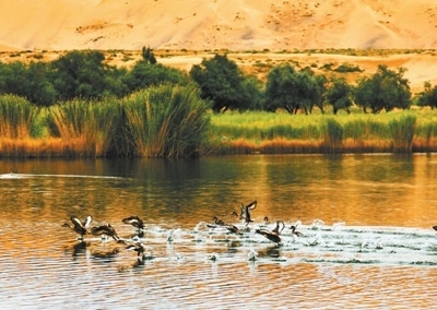 鳥兒在巴丹吉林沙漠中的海子里嬉戲。內(nèi)蒙古阿拉善右旗融媒體中心供圖