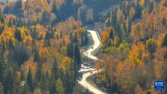 這是10月1日在新疆阿勒泰拍攝的阿禾公路沿途風景(無人機照片)。