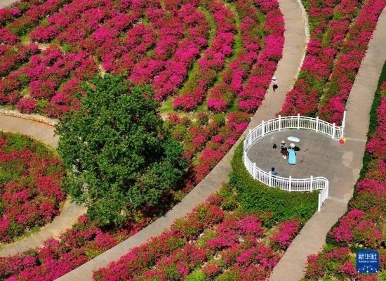游人在南寧青秀山風(fēng)景區(qū)葉子花園觀賞三角梅(10月25日攝,無(wú)人機(jī)照片)。