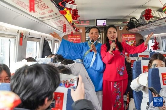 春運(yùn)前夕,中國鐵路上海局集團(tuán)有限公司合肥客運(yùn)段組織由鐵路職工組成的非遺表演小分隊(duì)登上C3685次旅客列車,為車廂內(nèi)的旅客帶來“廬州蛋雕”和黃梅戲表演等,并為旅客送上祝福。