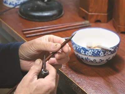 把毛料放在水中仔細(xì)清洗,就著燈光剔除一根根細(xì)微雜毛,將清理后的毛料聚合成圓直光滑、攏抱不散的錐形……走進(jìn)涇縣涇川鎮(zhèn)宣筆制作技藝代表性傳承人佘征軍的工作室,他正在為一支紫毫筆制作筆頭?!鞍拙右子性娫?,‘宣城之人采為筆,千萬毛中揀一毫’。此句講的是宣筆制作工藝的復(fù)雜精細(xì)。”佘征軍說。