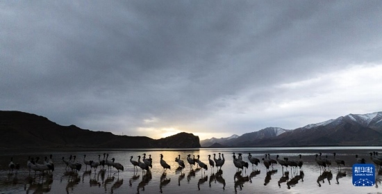 每年冬季,大批黑頸鶴在西藏拉薩市林周縣虎頭山水庫安家越冬?;㈩^山水庫周邊的沼澤地、湖泊及河灘為黑頸鶴提供了理想的越冬環(huán)境。