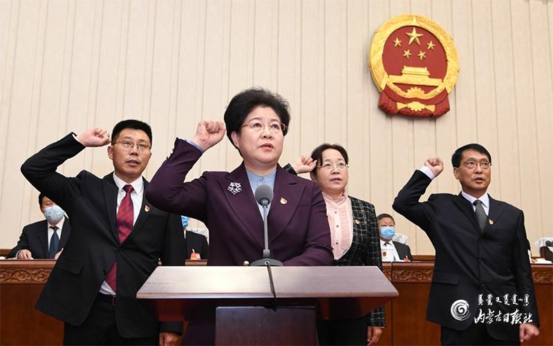 1月20日上午,自治區(qū)十三屆人大常委會(huì)第二十四次會(huì)議舉行了憲法宣誓儀式。自治區(qū)黨委書(shū)記、人大常委會(huì)主任石泰峰主持并監(jiān)誓。圖為新任職人員在依法進(jìn)行憲法宣誓。內(nèi)蒙古日?qǐng)?bào)記者 袁永紅 攝