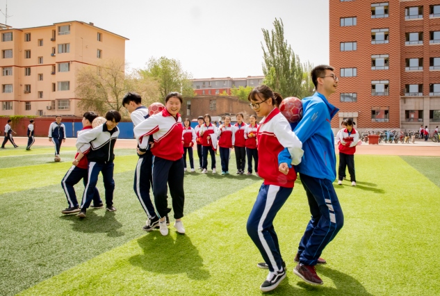 呼和浩特市第六中學(xué)的學(xué)生在操場上做趣味游戲。