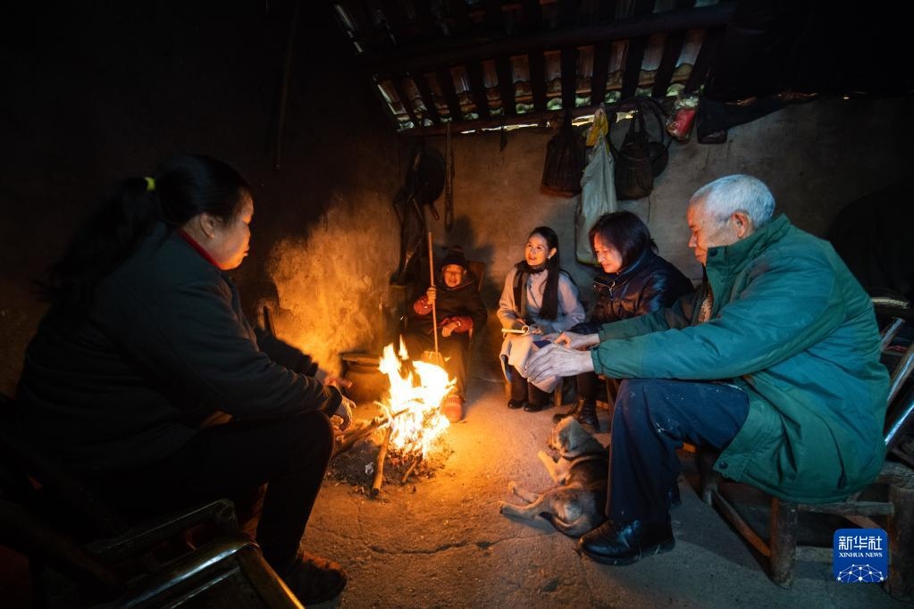 在湖南省常德市鼎城區(qū)草坪鎮(zhèn)楓林口村,全國(guó)人大代表杜美霜(右三)入戶(hù)與當(dāng)?shù)卮迕窠涣?2月16日攝)。新華社記者 陳思汗 攝