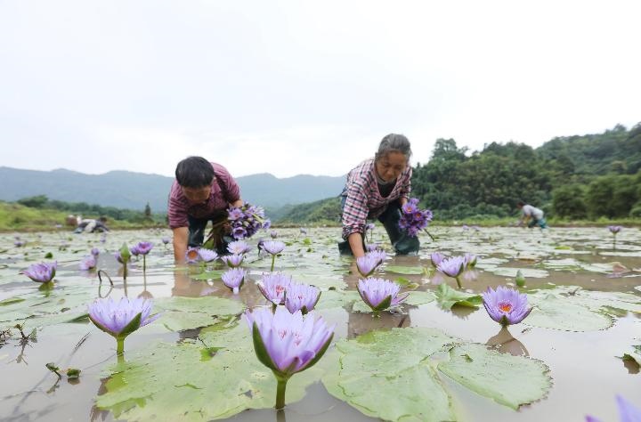 2022年6月28日,在貴州省赤水市寶源鄉(xiāng)玉豐村,村民在采摘香水蓮花。近年來,貴州省赤水市寶源鄉(xiāng)采取“黨支部+合作社+農(nóng)戶”模式,引導農(nóng)民種植集觀賞、藥用、食用為一體的香水蓮花,帶動農(nóng)民增收,助力鄉(xiāng)村振興。新華社發(fā)(王長育 攝)