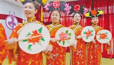 這是呼和浩特市新城區(qū)文化館老年滿族太平鼓舞隊(duì)表演時(shí)的一個(gè)場景。