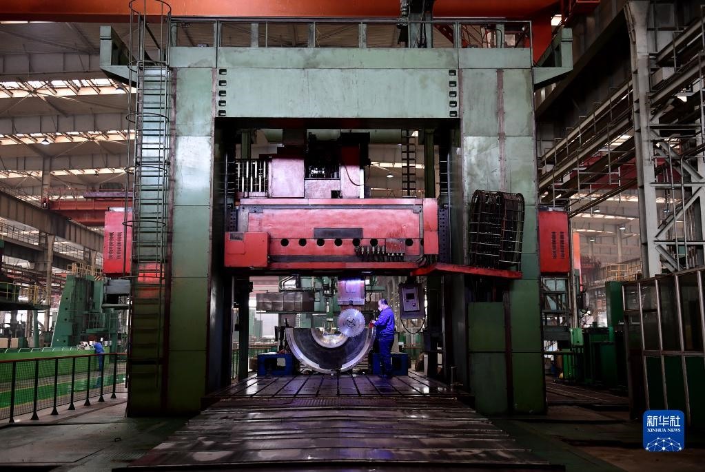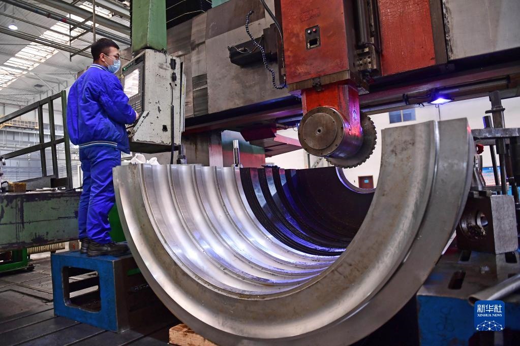 2020年3月16日,在沈陽(yáng)鼓風(fēng)機(jī)集團(tuán)股份有限公司生產(chǎn)車(chē)間,工人操作機(jī)器加工產(chǎn)品內(nèi)機(jī)殼。新華社記者 楊青 攝