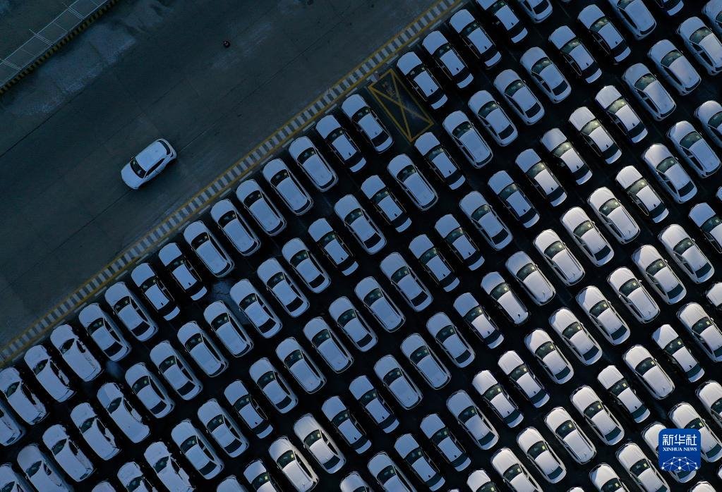 2021年1月29日,一輛運(yùn)送中的商品車(chē)行駛在大連港汽車(chē)碼頭(無(wú)人機(jī)照片)。新華社記者 姚劍鋒 攝