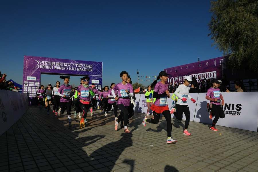 10月17日上午,2020呼和浩特女子半程馬拉松賽在蒙古風(fēng)情園鳴笛開跑。