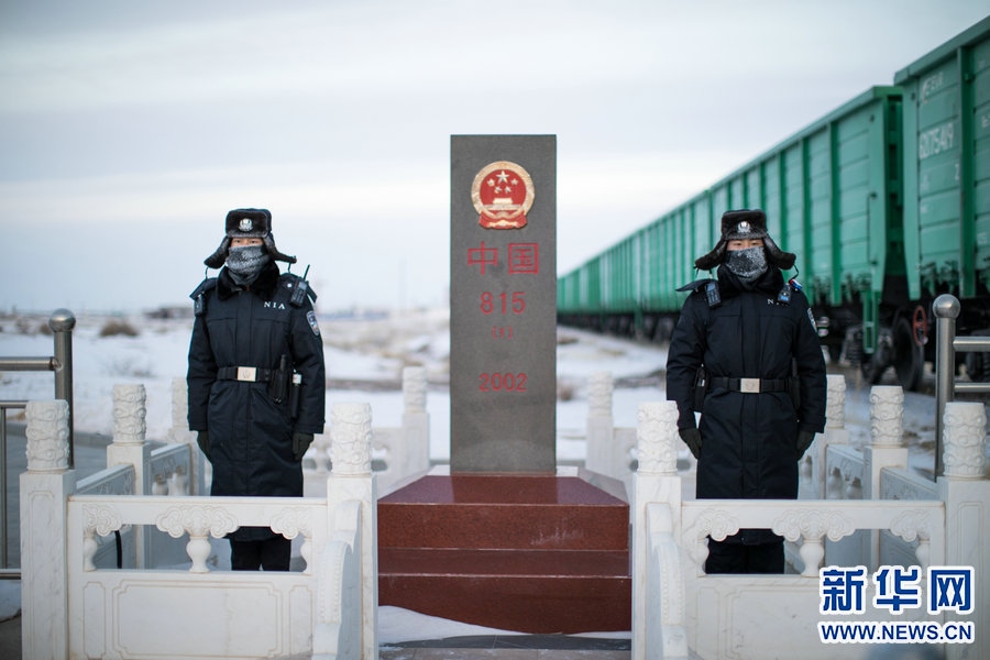 12月28日,二連出入境邊防檢查站民警在中蒙邊境815號(hào)界碑前執(zhí)勤,民警帽子和防寒面罩上掛滿冰霜。新華網(wǎng)發(fā)(郭鵬杰 攝) -